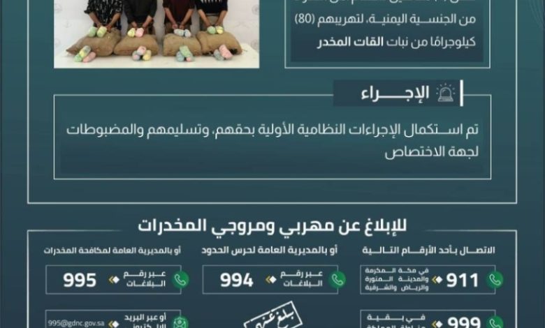 قبضت الدوريات البرية لحرس الحدود في منطقة عسير على أربعة أشخاص من الجنسية اليمنية، لتورطهم في تهريب 80 كيلوجراما من نبات القات المخدر. تم اتخاذ الإجراءات النظامية اللازمة ضدهم وتم تسليمهم والمضبوطات للجهات المختصة.