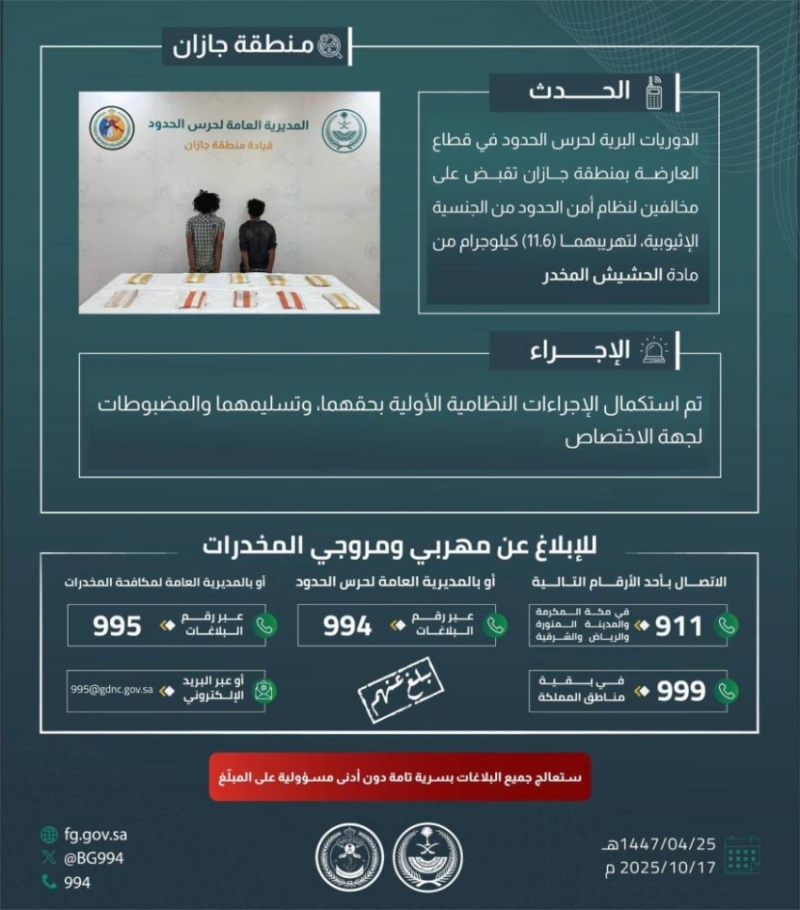 ضبط متهمين في جازان بتهريب 11.6 كجم من الحشيش