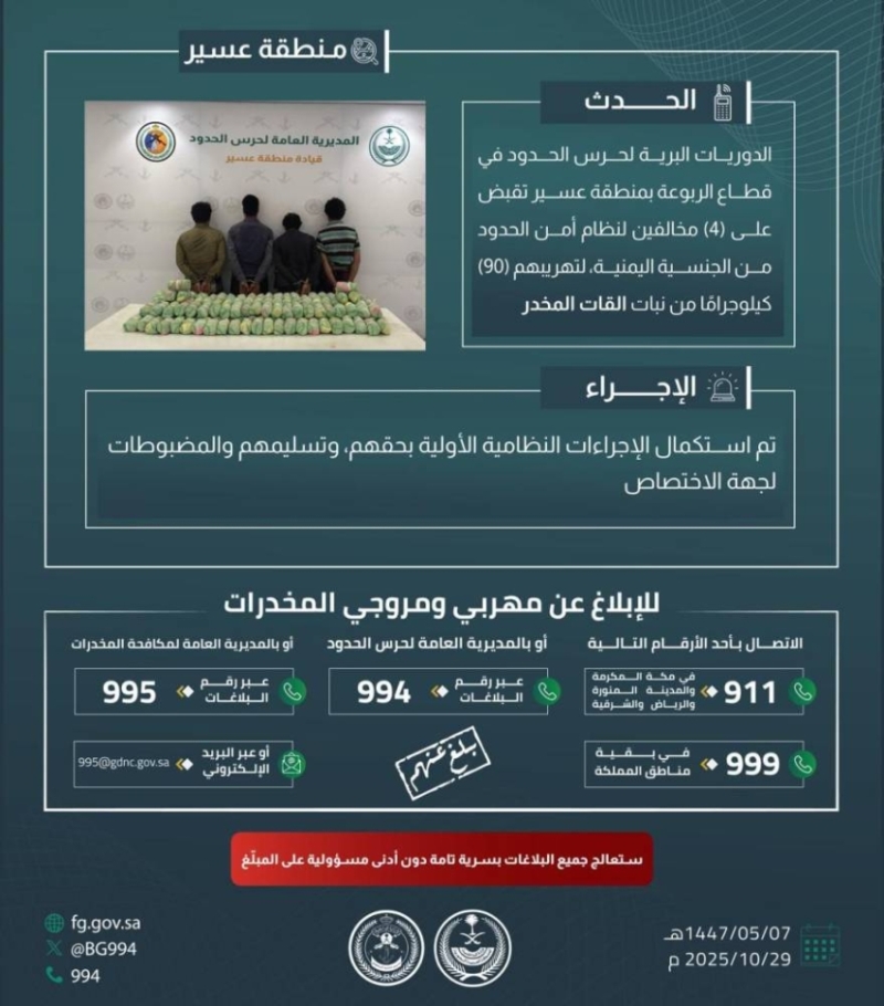 قبضت الدوريات البرية لحرس الحدود في منطقة عسير على أربعة مخالفين من الجنسية اليمنية، لتهريبهم كمية كبيرة من نبات القات المخدر. وفقًا للمعلومات الرسمية، تم ضبطهم وبحوزتهم 90 كيلوجرامًا من القات خلال العملية.