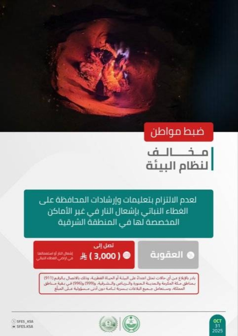 تم ضبط مواطن مخالف لنظام البيئة في المنطقة الشرقية بسبب اشعال النار في غير الأماكن المخصصة لها، حيث قامت القوات الخاصة للأمن البيئي بتطبيق الإجراءات النظامية بحقه، وأكدت أن العقوبة تصل إلى غرامة قدرها 3,000 ريال.