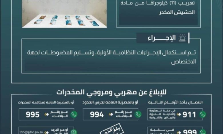 حرس الحدود في جازان يحبط عملية تهريب 11 كيلوجرامًا من المخدرات