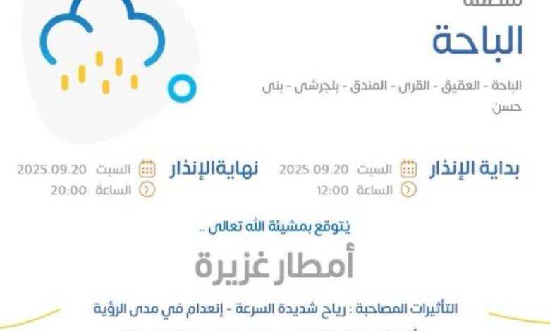 تحذير من هطول أمطار غزيرة ورياح شديدة تضرب منطقة الباحة